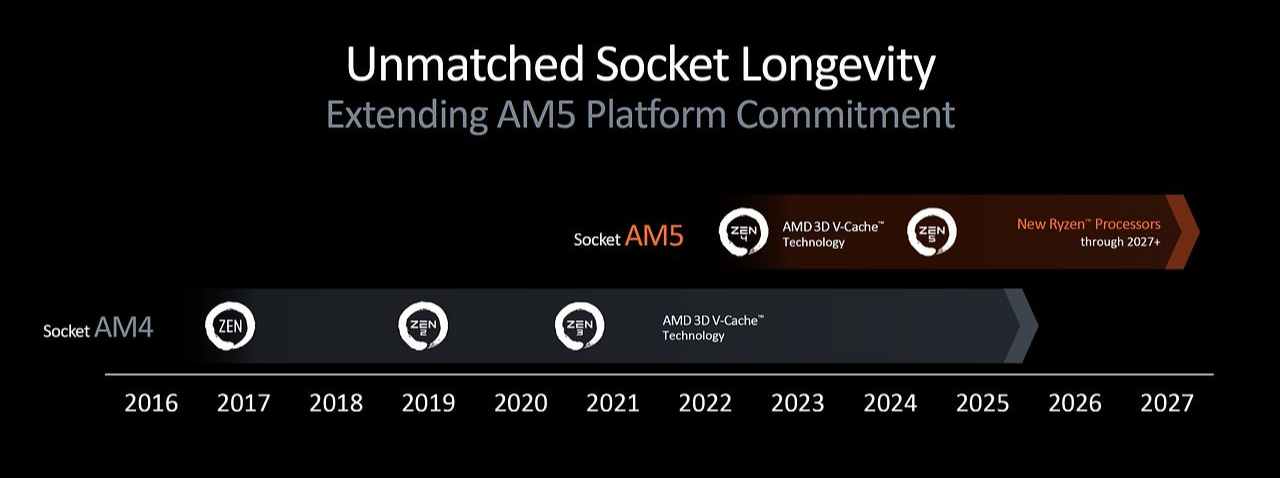 더 나아가 AMD는 2022년 9월에 라이젠 7000번대와 함께 공개한 AM5 소켓을 당초 공개할 때에는 2025년까지 유지하겠다 했지만 점차 늘려가더니 결국 👍 최소 2027년까지 지원하겠다는 발표와 함께 AMD 사용자들의 환호를 이끌어내기도 했다.