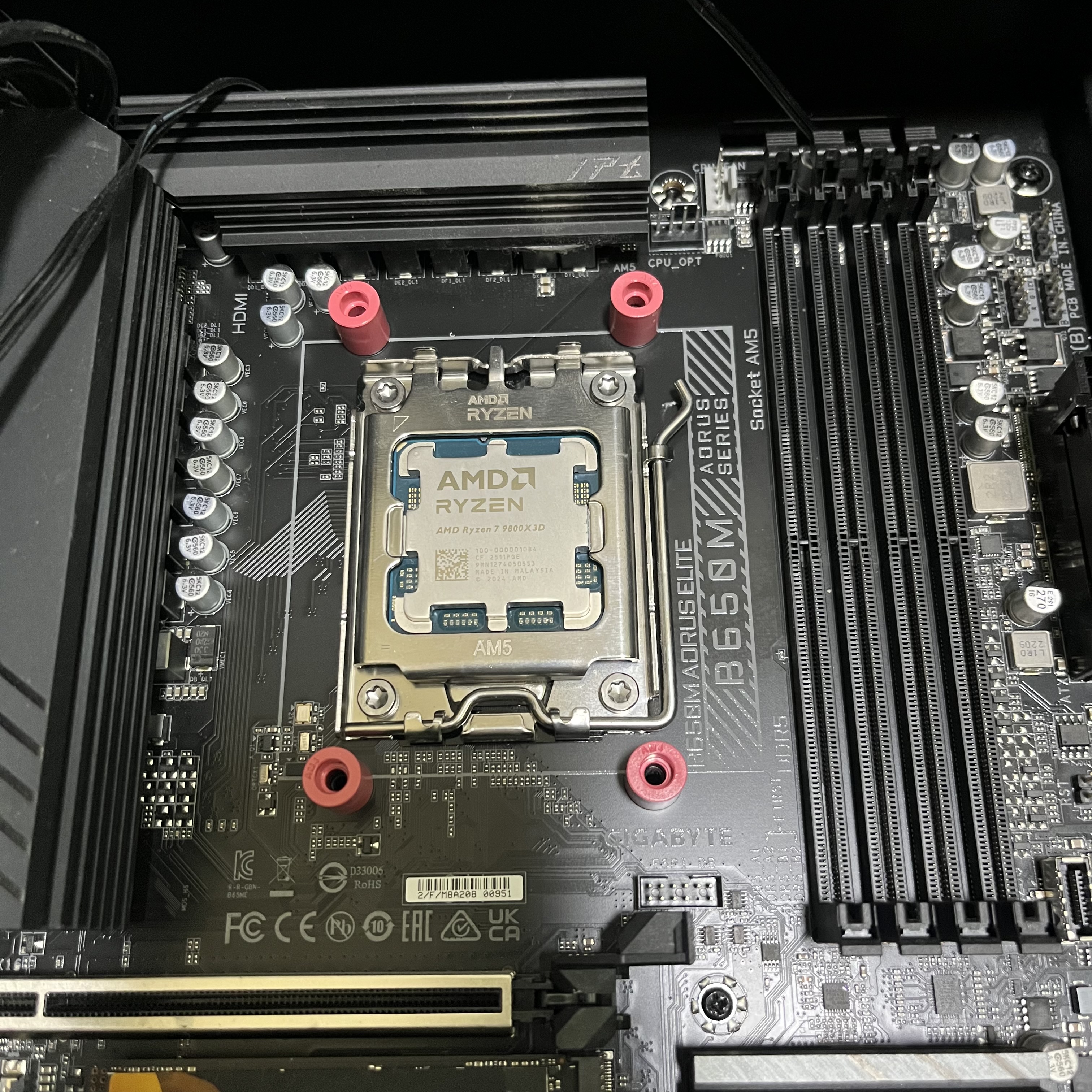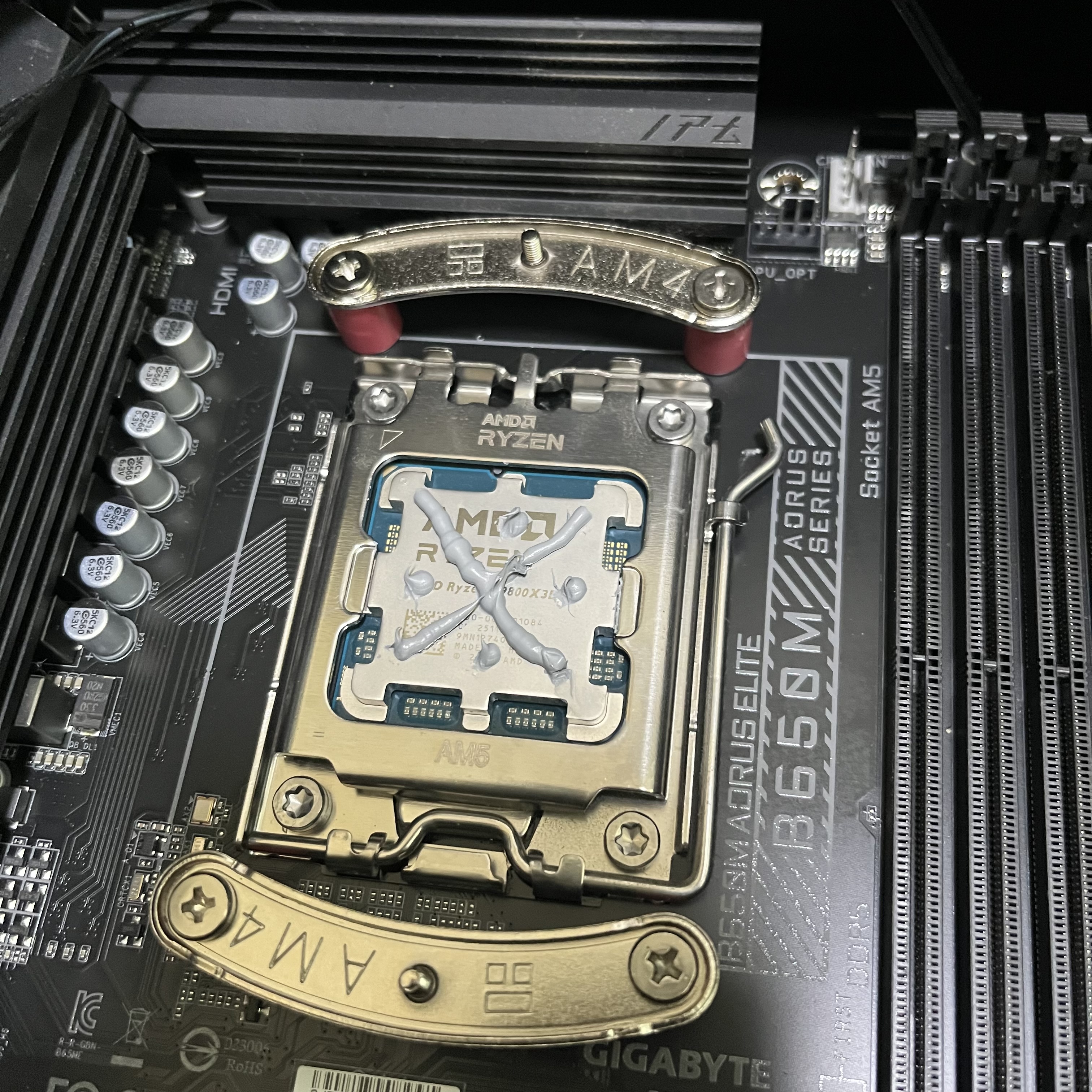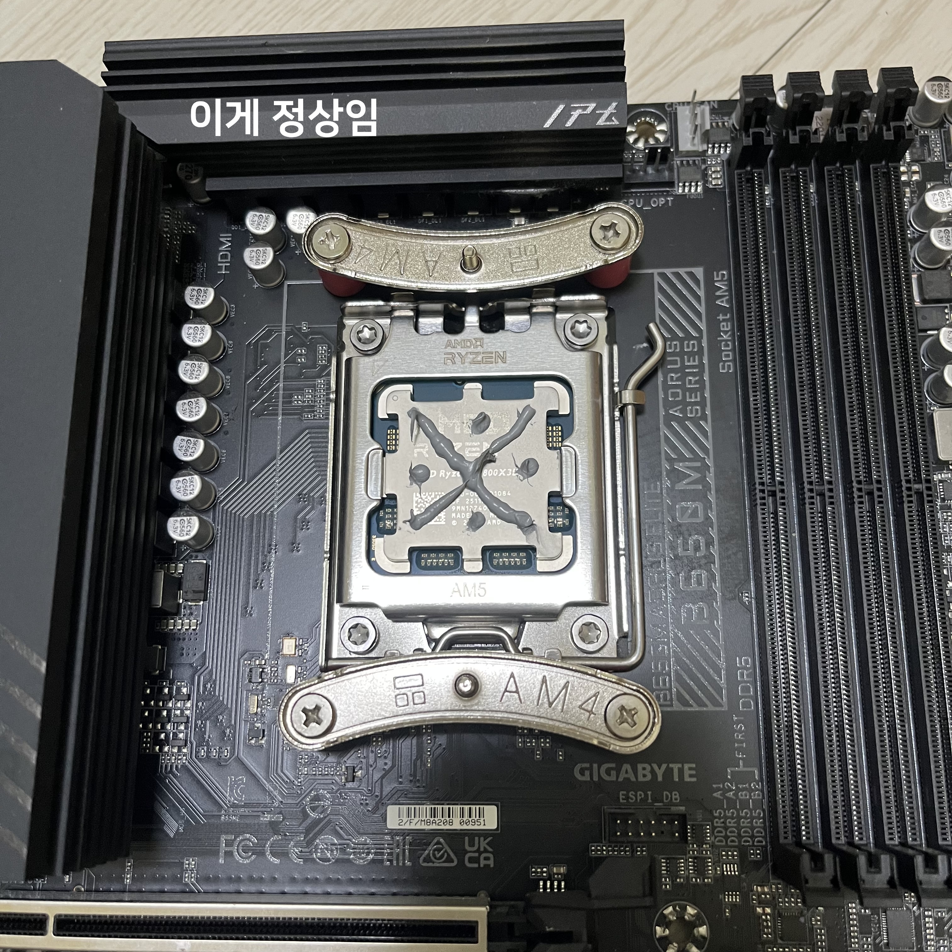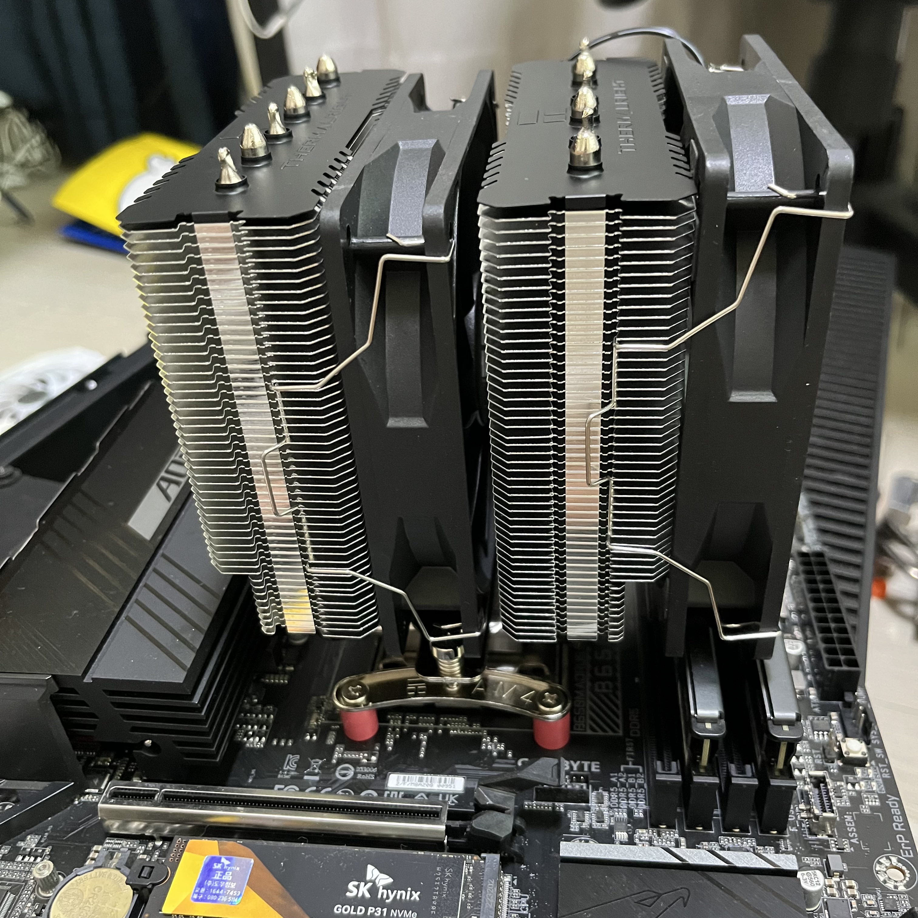 순간 AM4/AM5가 아닌 다른 CPU에만 쓸 수 있는 쿨러가 온 건가 싶은 생각에 너무 당황했는데 이걸 깨닫고 난 후에 서린씨앤아이 고객센터에서도 카카오톡으로 답변이 왔다. "넵. 보드쪽 브라켓이 반대네요." 😁 그렇게 브라켓의 방향을 올바르게 놓고 나서 쿨러를 올려보니 딱 맞게 잘 들어가더라.