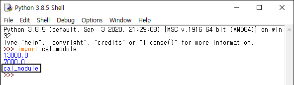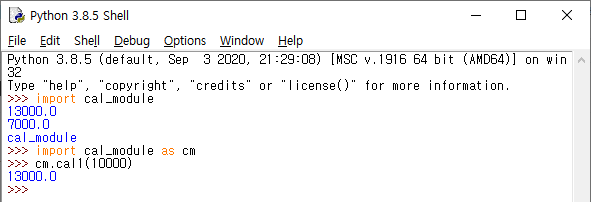 그렇다면 이제 모듈을 사용하기 위핸 명령어의 형태는 '모듈명.함수명(변수값)'. 즉 앞에서는 cal_module.cal1(10000)이었지만, 이제는 cm.cal1(10000)을 사용하면 된다!