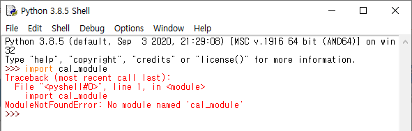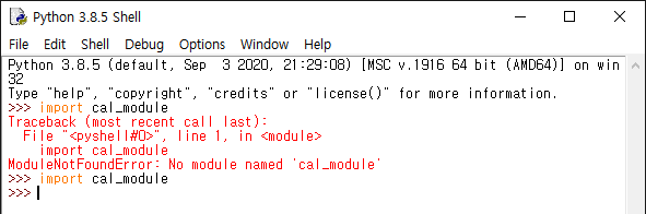 cal_module이 다른 폴더에 있어서 IDLE이 그 모듈을 불러올 수 없는 상황cal_module 파일을 C:/anaconda 경로 내에 위치시킨 후 import cal_module 을 입력하게 되면 오류가 발생하지 않는 모습