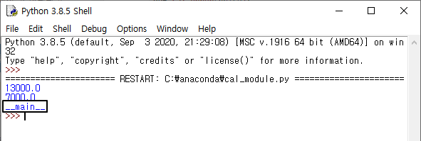 뭔가 이상하다. __name__을 출력하랬더니 __main__을 출력한다.IDLE을 이용해서 import cal_module을 실행했더니 또 다른 값이 나온다.