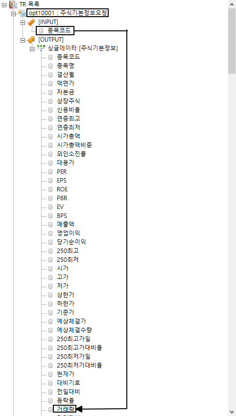 따라서 위의 opt10001에 대한 정보를 요청하기 위해서는 다음과 같은 코드가 필요하다.