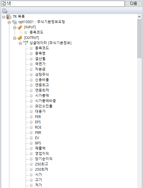 다음으로 `TrCode`는 키움증권에서 제공하는 KOA Studio 안에 보면 TR 목록이라는 것이 나오고, 그 안에는 opt10001, opt10080, opt10081 등등 opt로 시작하는 여러 가지 메뉴들이 있는데, 그것이 바로 TrCode이다.