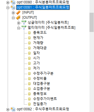 다시 본론으로 돌아와, 아까 제작하다 말았던 opt10081이라는 함수 내에 종목 코드 외에도 여러 가지 아이템명을 입력하여 데이터를 불러오도록 하자. 아이템 명은 위의 사진에 있는 여러 가지 정보들이 모두 아이템 명이기 때문에, 아래의 코드에 포함되지 않은 정보가 궁금하다면 그에 관한 정보도 따로 구축해도 된다. 본인이 사용할 정보라면 가리지 말고 모두 사용하도록 하자.