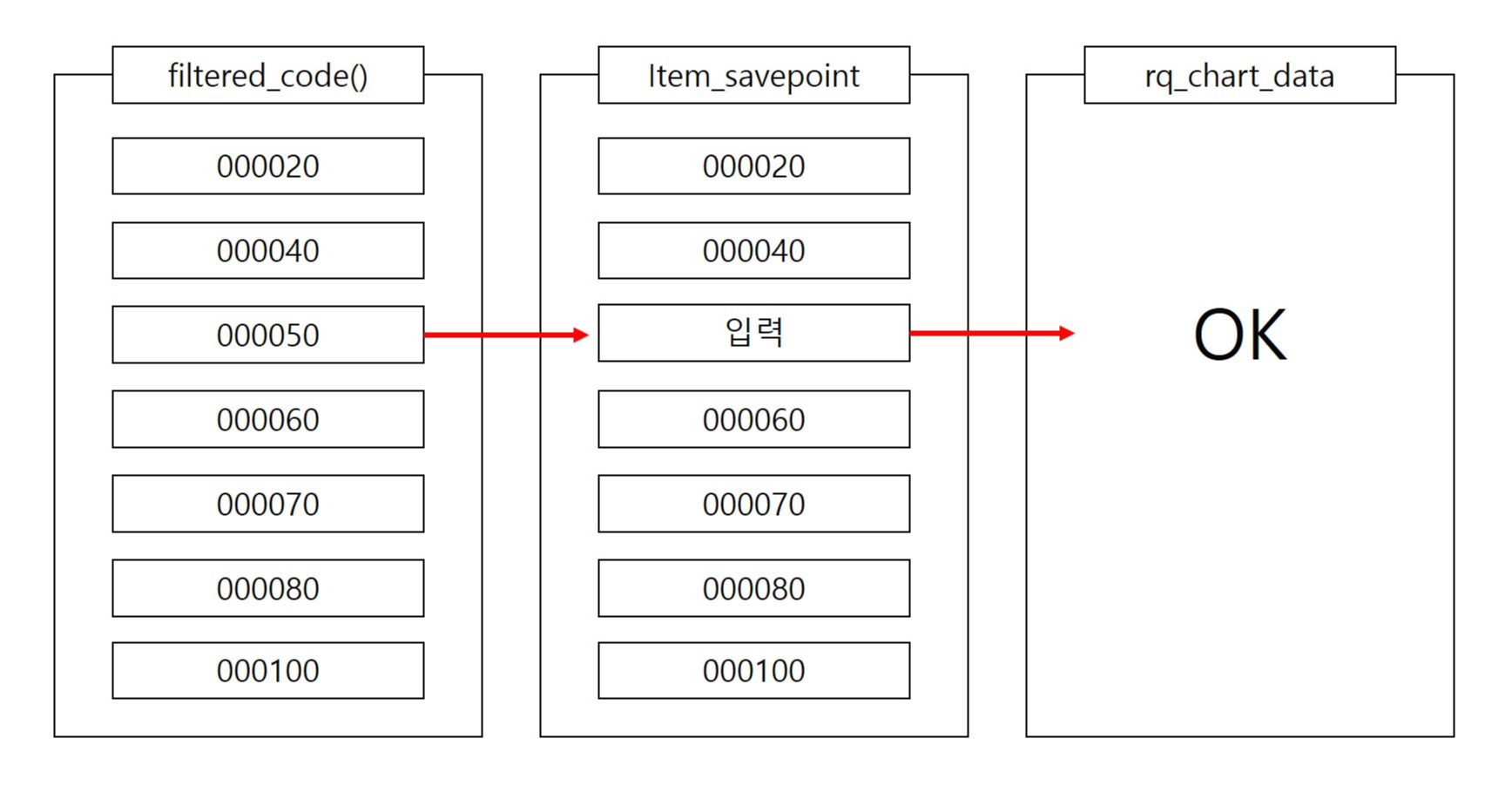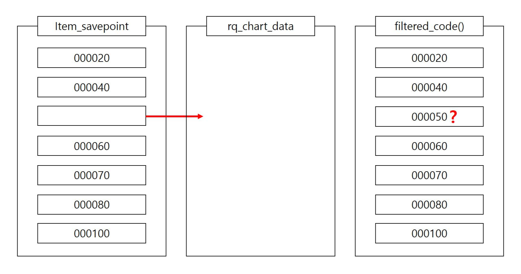 물론 이와 관련하여, 차트 데이터를 조회하기 전에 앞서 filtered_code() 함수의 결과값을 조회한 후에 그 결과값 안에 포함된 종목 코드를 item_savepoint 데이터베이스에 입력하도록 하는 절차를 거친 후에 차트 데이터를 조회하겠다면 문제가 없겠지만 만약 그렇지 않은 경우에는 우리의 item_savepoint 내에 있는 종목코드가 filtered_code에 있는지 없는지를 확인한 후에 차트 데이터를 조회해야 한다. 말이 조금 어려운데, 아래의 그림을 통해 이해해보도록 하자.