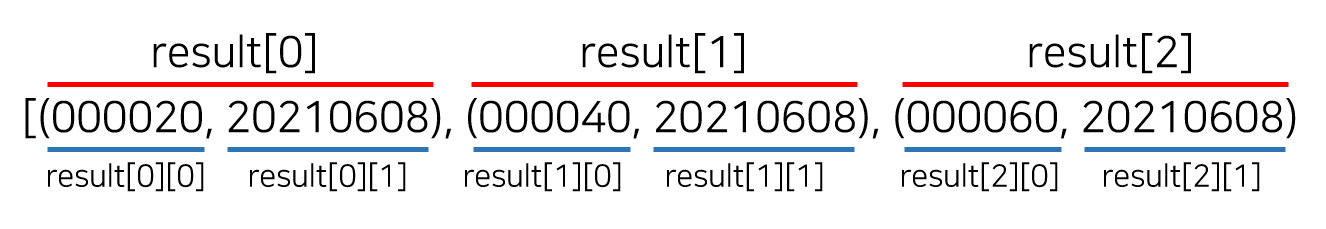 즉 result[0]을 쓰면 (000020, 20210608)이라는 두 개의 값을 얻어오지만 result[0][0]을 쓰면 000020을, result[0][1]을 쓰면 20210608을 얻어온다는 것이다. 여기서 우리는 특정 종목코드의 일봉 차트 데이터가 저장된 최신 일자를 얻어올 수 있는 것이다.